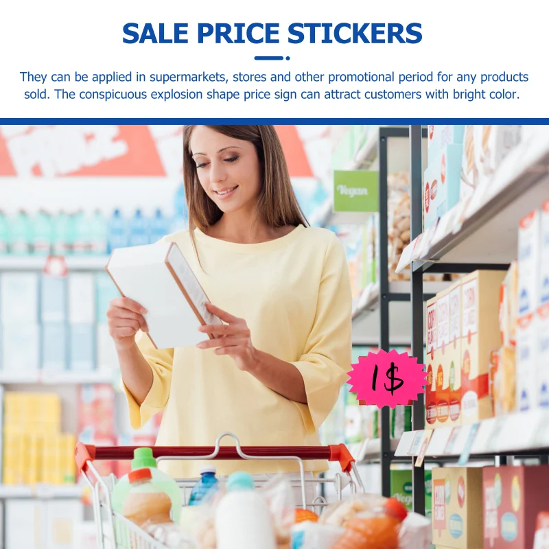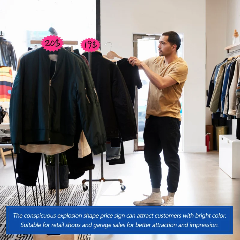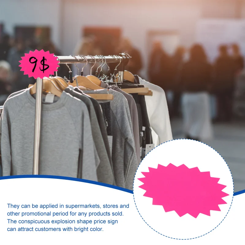Mark the price on the price tag according to specific products, an affordable display your product. Easy to use, the bright color can catch customers eyes, you can simply operate them without using other tools, convenient and practical. These sales explosion shape price signs can be pasted beside the product to attract customers' attention.